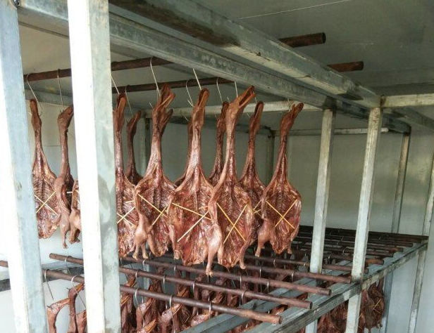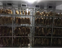 2肉制品熟化工藝是人為的提供合適的溫濕度完成物料的熟化、成分合成、轉(zhuǎn)換等過程。只有在適合的溫濕環(huán)境才能保證臘鴨的顏色和香味,否則達不到熟化的過程,那么臘鴨的香味就出不來,品質(zhì)也就降低了。